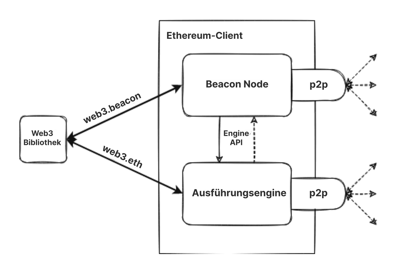 Diese Clients arbeiten zusammen, um den aktuellen Stand der Ethereum Chain zu verfolgen und den Nutzern die Interaktion mit dem Ethereum-Netzwerk zu ermöglichen. Das modulare Design, bei dem mehrere Softwarekomponenten zusammenarbeiten, wird als eingekapselte Komplexität bezeichnet. Dieser Ansatz erleichterte die nahtlose Ausführung der Zusammenführung, macht die Wartung und Entwicklung von Client-Software einfacher und ermöglicht die Wiederverwendung einzelner Clients, beispielsweise im Layer-2-Ökosystem.