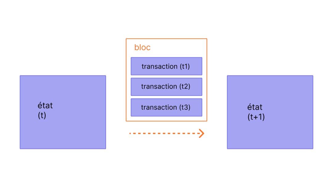 Afin de s'assurer que tous les participants du réseau Ethereum restent synchronisés et s'accordent sur l'historique exacte des transactions, les transactions sont traitées par blocs. Cela signifie que des dizaines (ou centaines) de transactions sont engagées, acceptées et synchronisées en même temps.