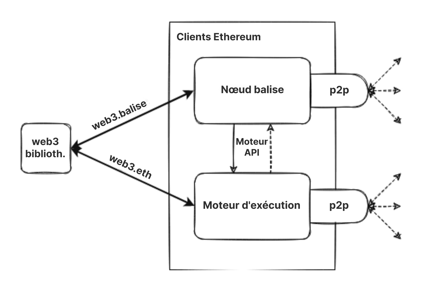 Ces clients travaillent ensemble pour suivre la tête de la chaîne Ethereum et permettre aux utilisateurs d'interagir avec le réseau Ethereum. La conception modulaire avec plusieurs logiciels fonctionnant ensemble est appelée complexité encapsulée. Cette approche a permis de plus facilement exécuter La Fusion de manière fluide, facilite la maintenance et le développement du logiciel client et permet la réutilisation des clients individuels, par exemple au sein de l'écosystème de la couche 2.