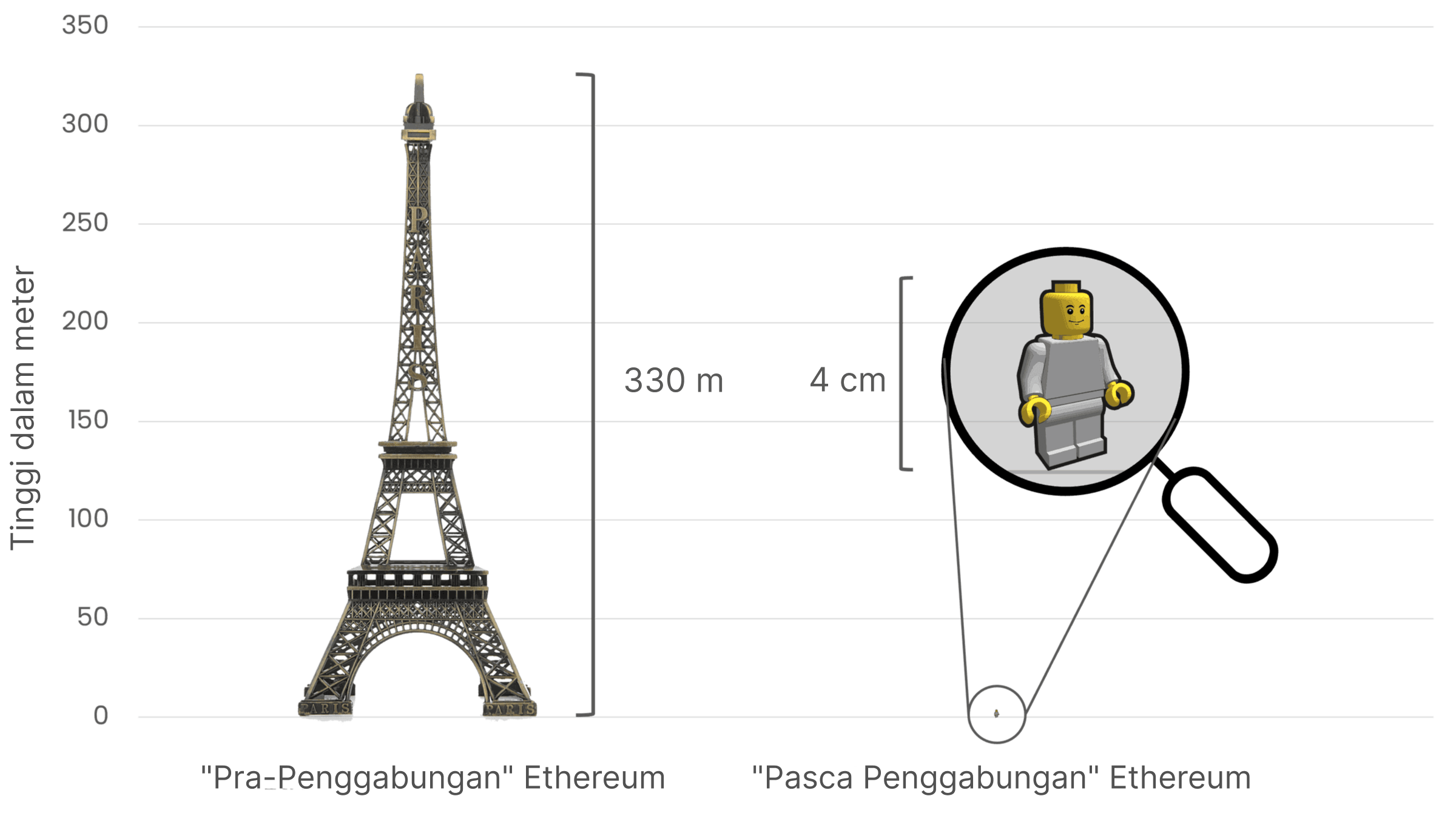 CCRI memperkirakan bahwa Penggabungan mengurangi konsumsi listrik tahunan Ethereum hingga lebih dari 99,988%. Demikian juga, jejak karbon Ethereum berkurang sekitar 99,992% (dari 11,016,000 menjadi 870 ton CO2e). Untuk menempatkan hal ini dalam perspektif, pengurangan emisi seperti pergi dari ketinggian Menara Eiffel ke sebuah figur mainan plastik kecil, seperti yang diilustrasikan pada gambar di atas. Hasilnya, biaya lingkungan untuk mengamankan jaringan berkurang secara drastis. Pada saat yang sama, keamanan jaringan diyakini telah meningkat.