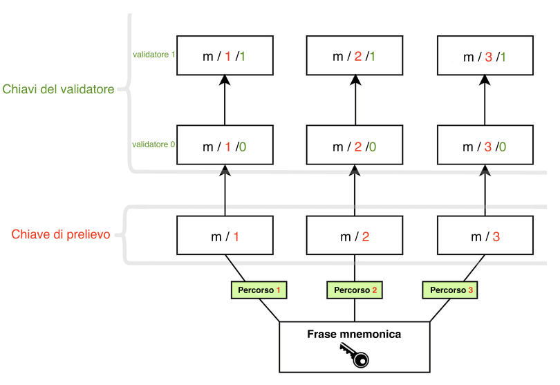 significa iniziare con la chiave principale e seguire il ramo 2. Nello schema seguente, una singola frase mnemonica è utilizzata per memorizzare tre chiavi di prelievo, ognuna con due validatori associati.