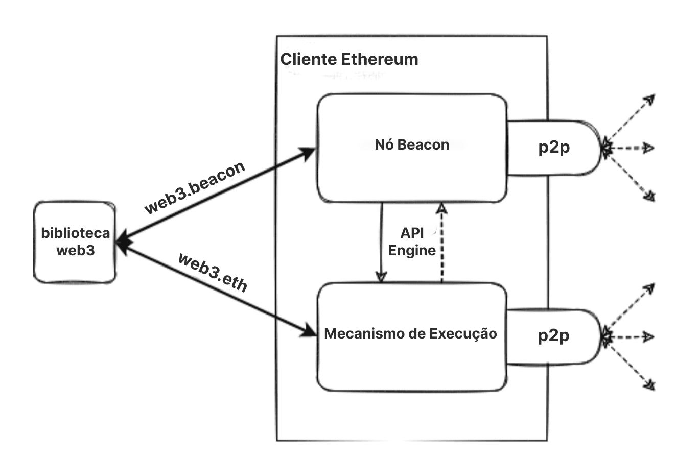 - O cliente de consenso (também conhecido como Beacon Node, cliente CL ou anteriormente cliente Eth2) implementa o algoritmo de consenso de prova de participação, o qual permite que a rede realize um acordo com base nos dados validados do cliente de execução. Há também um terceiro pedaço de software, conhecido como 'validador' que pode ser adicionado ao cliente de consenso, permitindo que um nó participe na segurança da rede.
