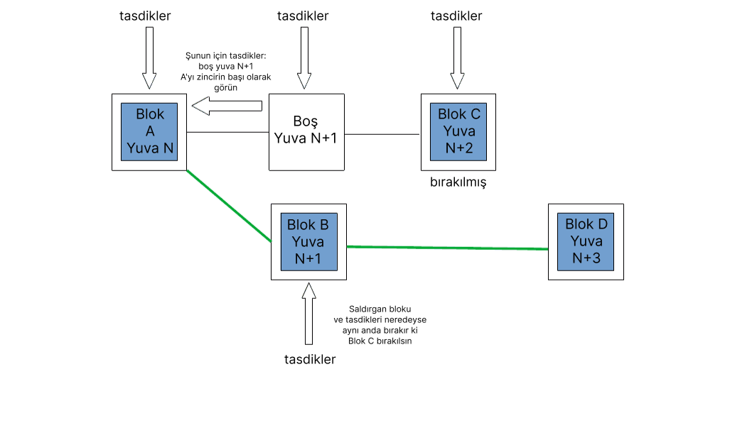 Tek blok yeniden düzenleme saldırısının kavramsal diyagramı yukarıda açıklanmıştır (şuradan alınmıştır: https://notes.ethereum.org/plgVdz-ORe-fGjK06BZ_3A#Fork-choice-by-block-slot-pair)