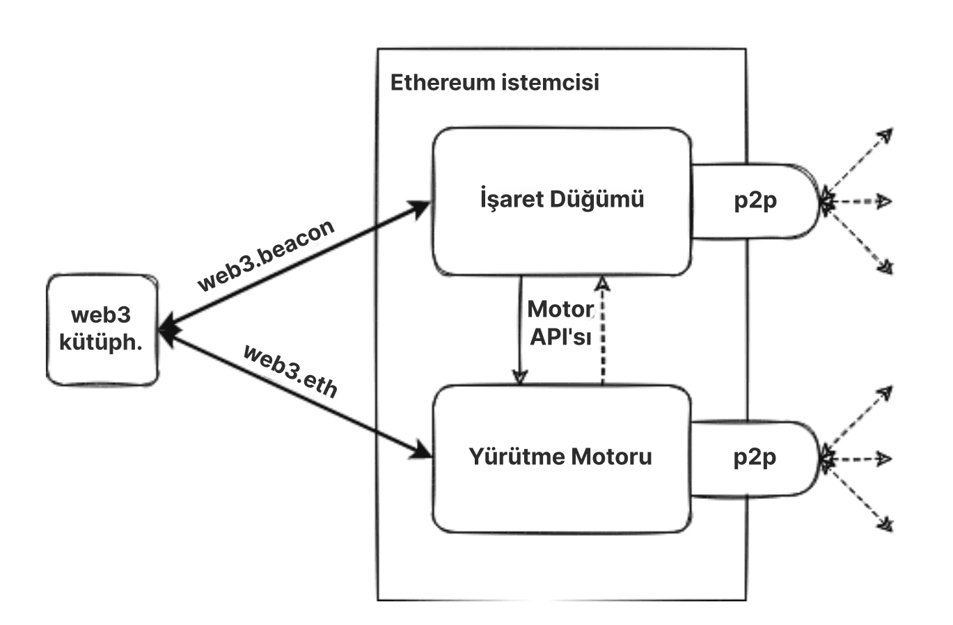 - Yürütüm İstemcisi (Yürütüm Motoru, EL istemcisi ya da eski adıyla Eth1 istemcisi olarak da bilinir) ağda yayınlanan yeni işlemleri takip eder, bunları Ethereum Sanal Makinesinde çalıştırır ve son durumlarıyla tüm güncel Ethereum verilerinin veritabanını tutar.